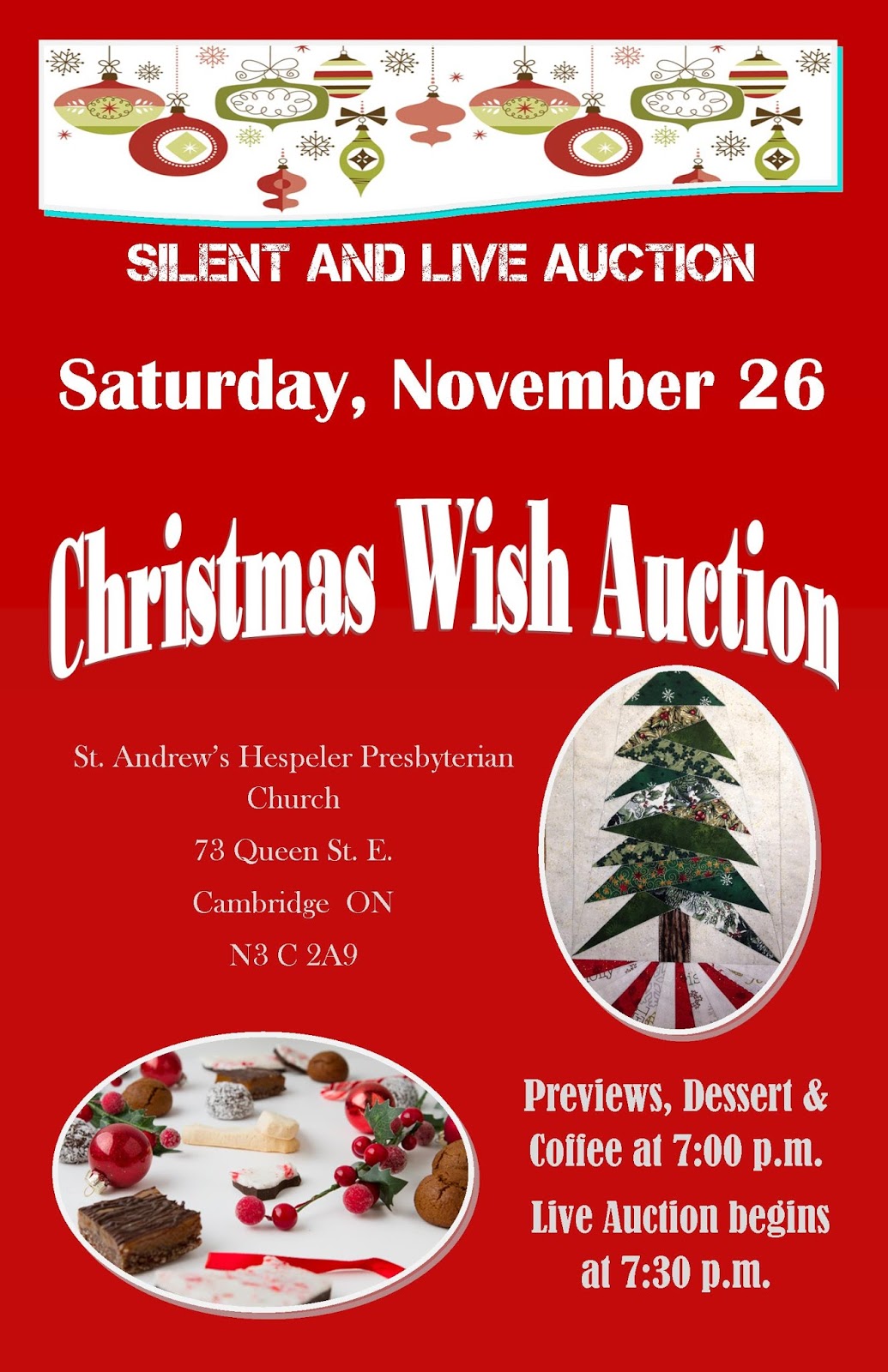 The Auction Committee has been working hard on our Christmas Wish Live & Silent Auction which will be on Saturday, November 27th. Desserts/coffee/tea and viewing will begin at 7:00 pm and the live auction will start at 7:30 pm. Bring your friends! Bring your Christmas List because you just might be able to do your Christmas shopping! Children are welcome to come (wear your pajamas, bring a pillow, blanket or sleeping bag) to watch a movie and have popcorn in the foyer.