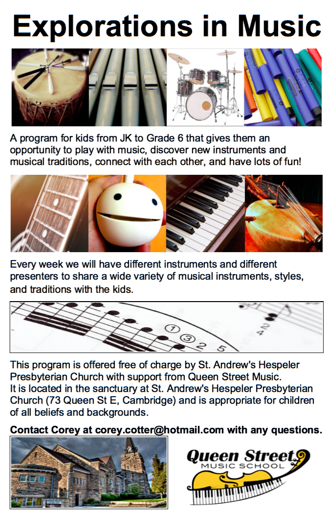 The program will run most Sundays after church and it promises to be a fun time, so I hope you will check it out, no matter your age. We are grateful for the support and contributions of Queen Street Music.