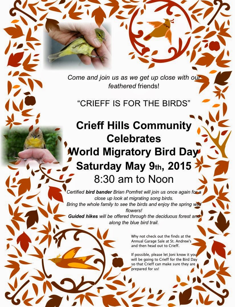 We will be meeting together at Crieff Hills on May 9th at 9:30 am (the day actually runs from 8:30 am - noon, but we will meet as a group at 9:30 am), to participate in their World Migratory Bird Day!