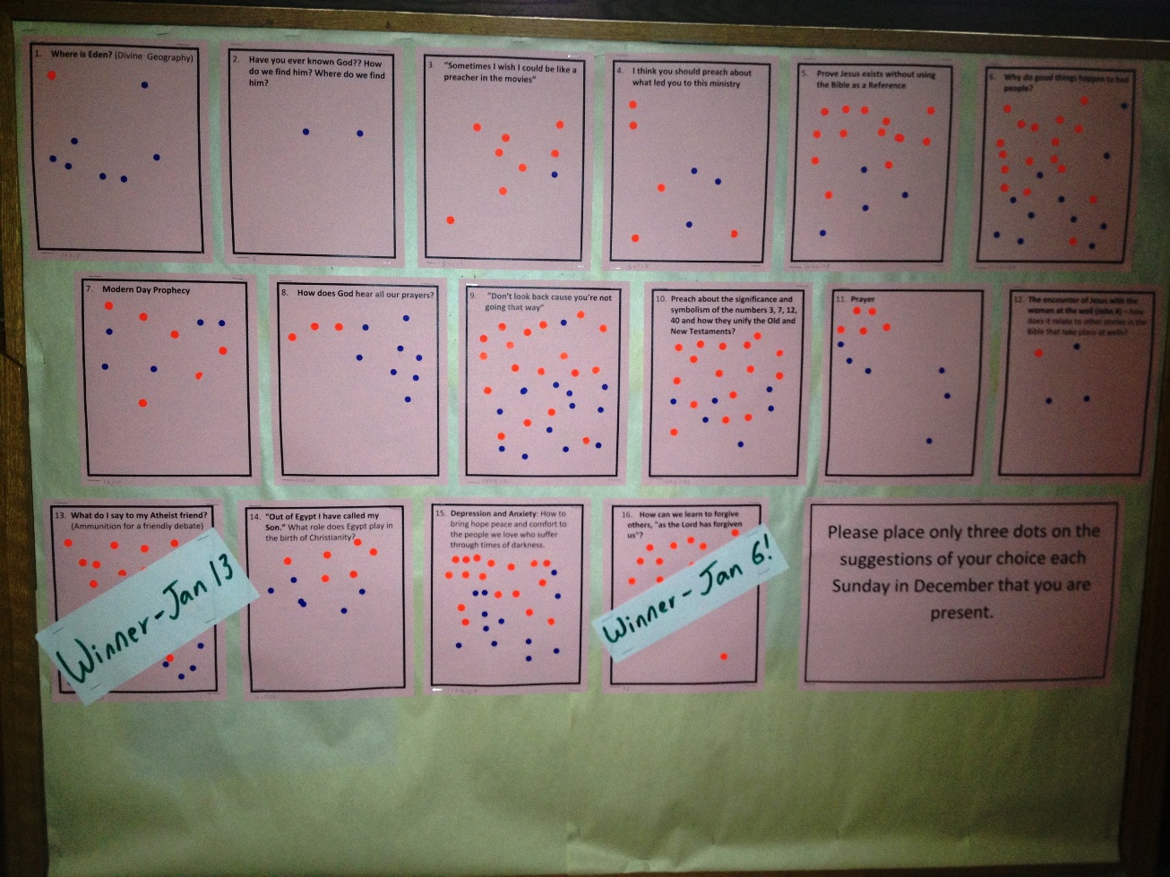 Remember, folks, that the winner last week (and the sermon topic selected for January 6 was "How can we learn to forgive others, "as the Lord has forgiven us"?"
